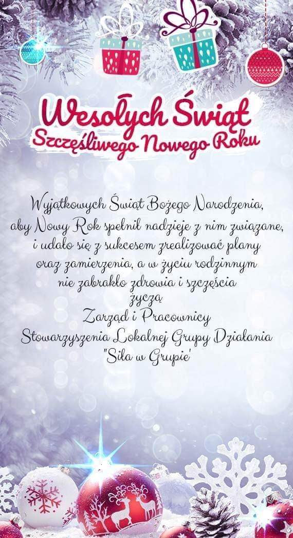 Stowarzyszenie Lokalnej Grupy Działania "Siła w Grupie", składa serdeczne życzenia Świąteczno - Noworoczne wszystkim członkom, mieszkańcom gmin oraz sympatykom.